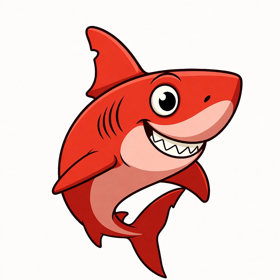 A vibrant red cartoon shark with large expressive eyes and a wide toothy grin swims playfully. It features sharp fins, white underbelly, and detailed gills on a plain white background. The illustration is bold and colorful, designed in a cute animated style.
