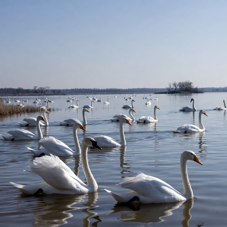 A large group of white swans swims gracefully on a calm lake surrounded by reeds. The swans feature elegant long necks and orange beaks, with some captured in motion flapping wings. The scene is set against a clear blue sky and distant trees.