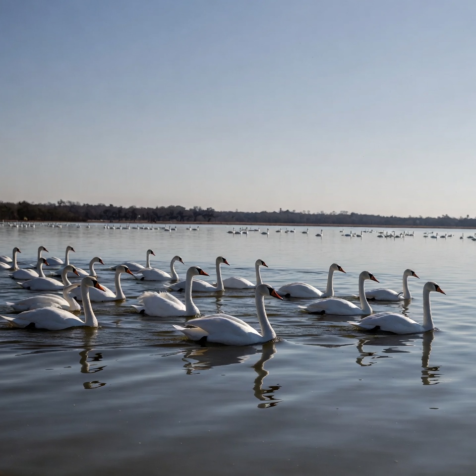 A large group of white swans swims together on a calm lake surface under a clear blue sky. Their reflections are visible in the still water, with distant trees and more swans along the shoreline. The swans have elegant long necks and orange beaks.