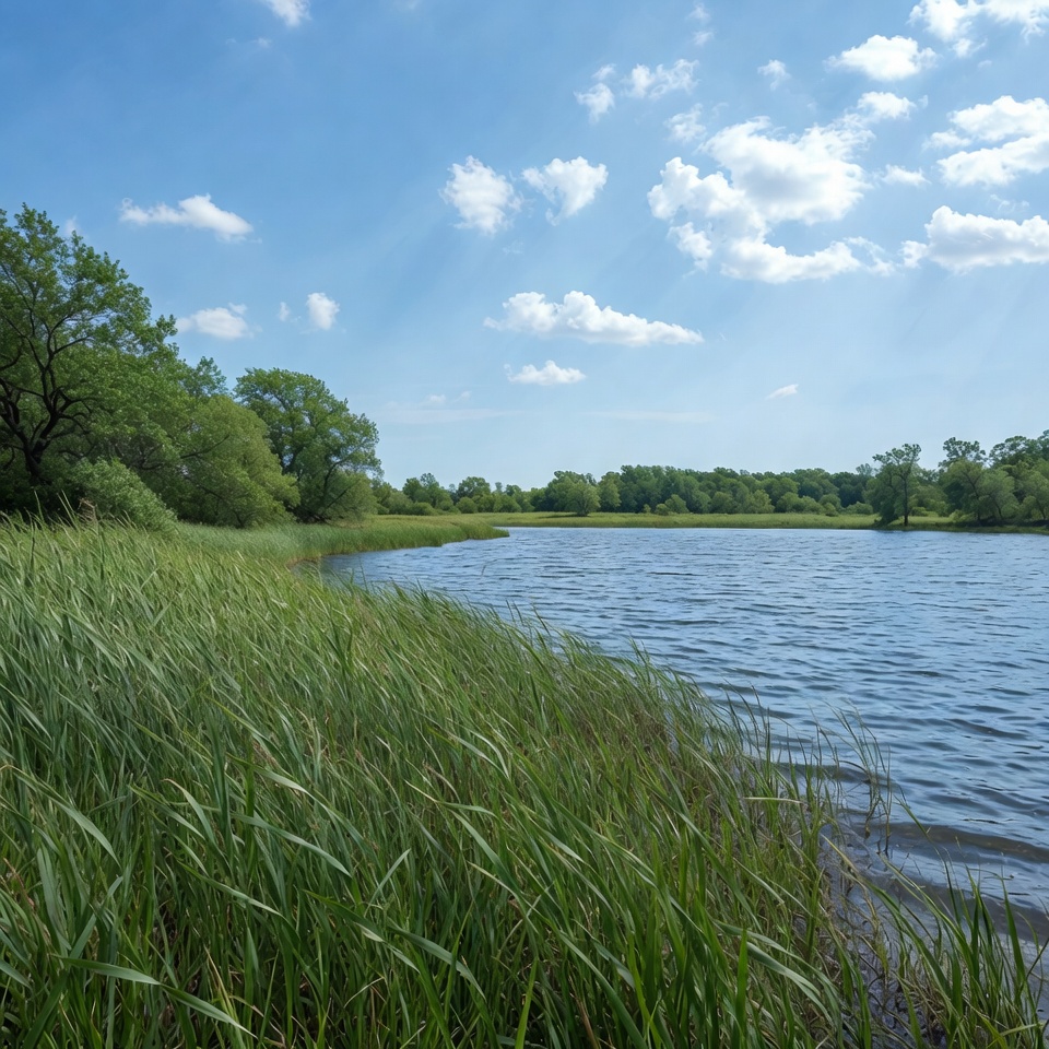 blue sky, blue water, bushes, calm water, clouds, environment, grass, green grass, green reeds, landscape, lush trees, natural, nature, outdoor, peaceful, reeds, riparian, riverbank, scenery, serene, shore, sky, sunlight, trees, water, wetland, lake
