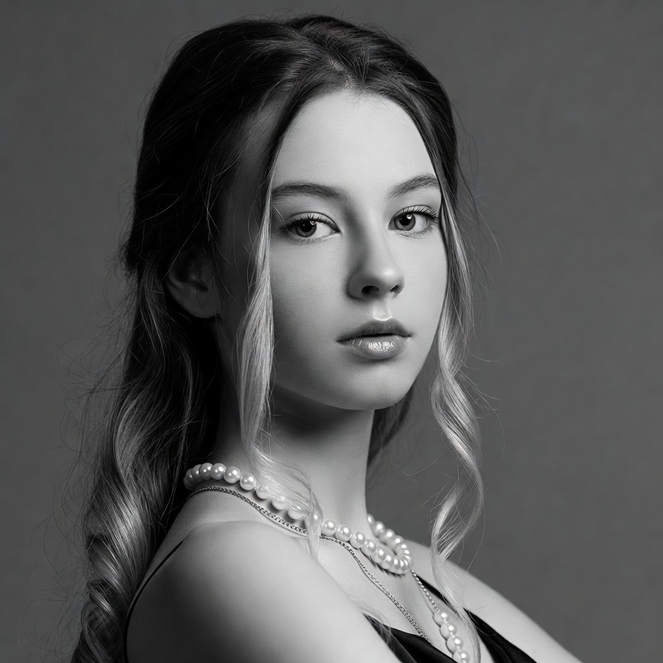 White, beauty, black and white, closeup, elegant, eyes, face, female, headshot, jewelry, lips, long hair, monochrome, necklace, pearl necklace, portrait, serious expression, wavy hair, young woman, woman
