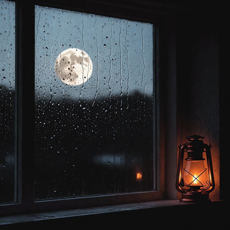 A large full moon shines through a window covered in rain droplets during a dark night. A glowing vintage lantern sits on the wooden windowsill beside the glass. The scene features a wet windowpane with water streaks and faint outdoor lights in the background.
