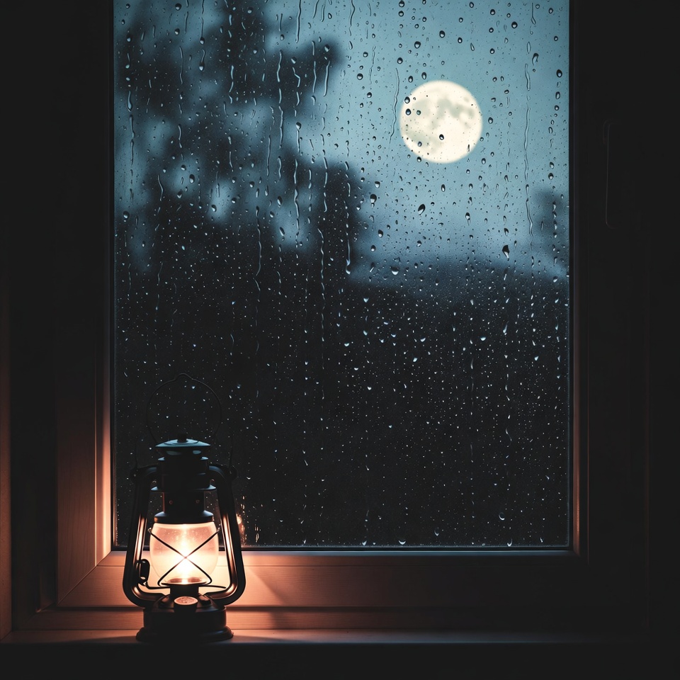 A glowing lantern sits on a windowsill in front of a window covered in rain droplets. A full moon shines through the wet glass amidst dark tree branches. The scene captures a rainy night atmosphere with warm lantern light contrasting the cool blue tones outside.