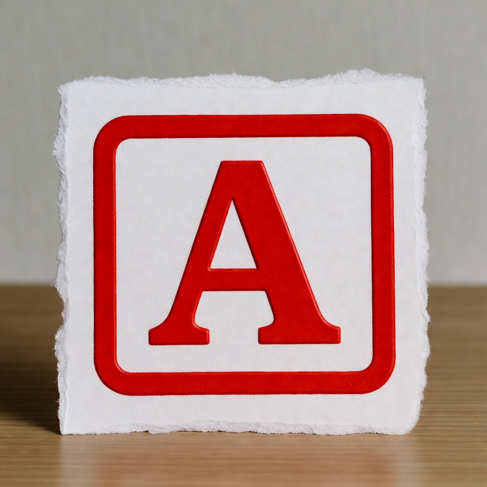 A large red letter A is centered within a red square frame on a white torn paper cutout. The paper has ragged edges and rests on a wooden surface against a light gray background. The design appears three-dimensional with raised edges.