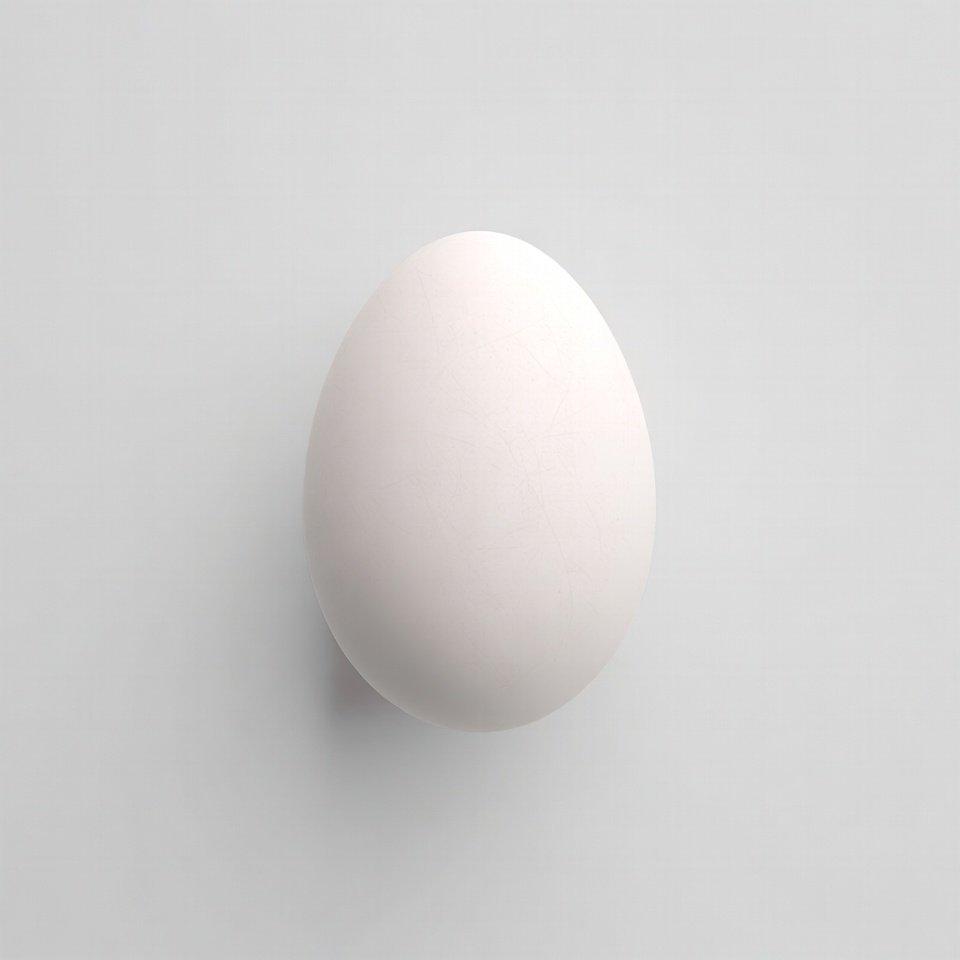 A smooth white egg is centered against a plain light gray background. The egg has an oval shape with a subtle glossy texture. It is isolated with soft lighting highlighting its curves.