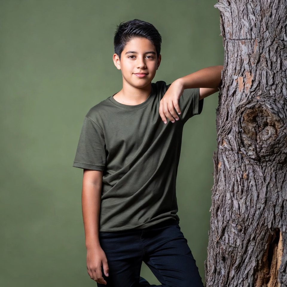 Latino, black pants, casual pose, child, dark hair, green background, green shirt, isolated background, kid, leaning tree, male, outdoor style, portrait, short hair, smiling boy, t-shirt, teenager, tree trunk, young boy, boy