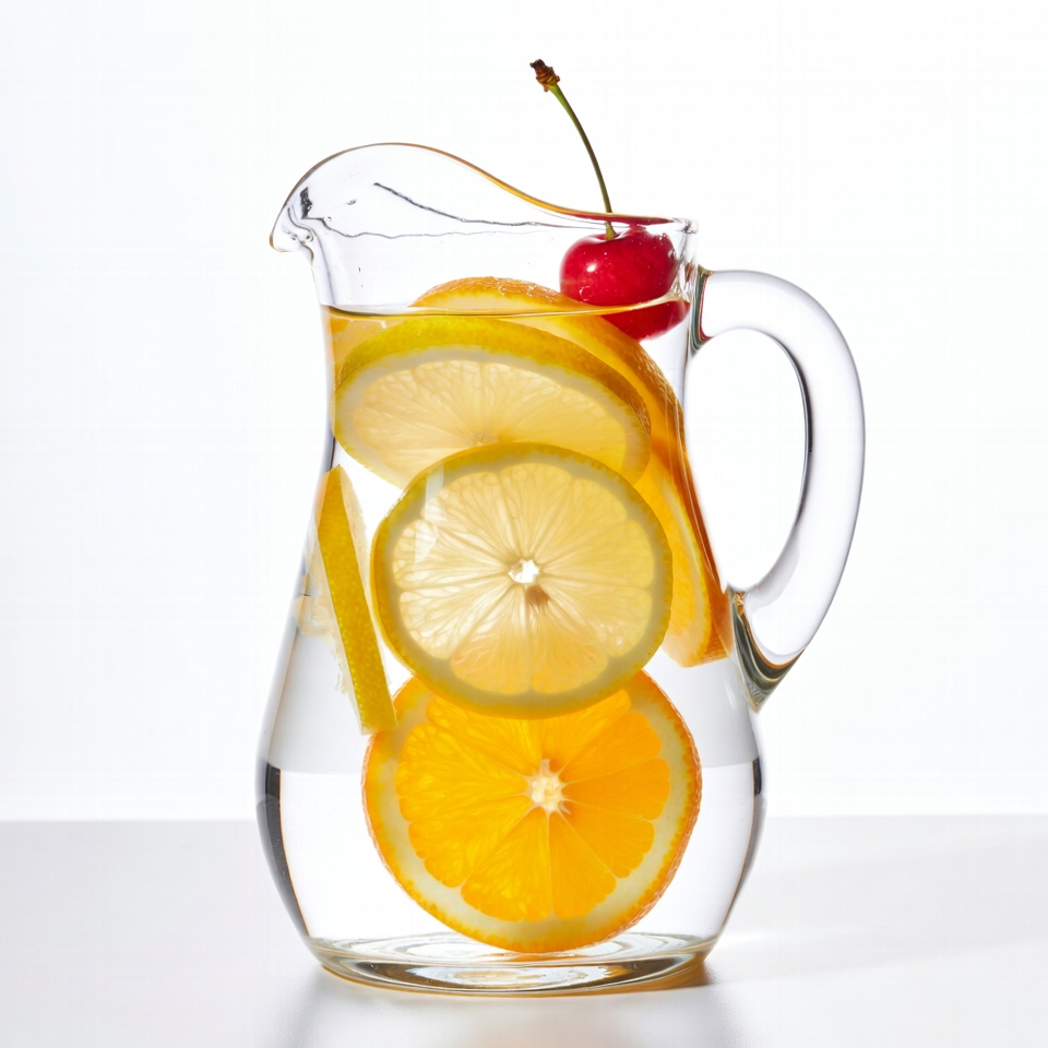 cherry, citrus, clear glass, fresh fruit, fruit, glass pitcher, infused water, lemon slices, lemons, orange slices, oranges, red cherry, slices, stacked fruit, transparent pitcher, water, white background, pitcher