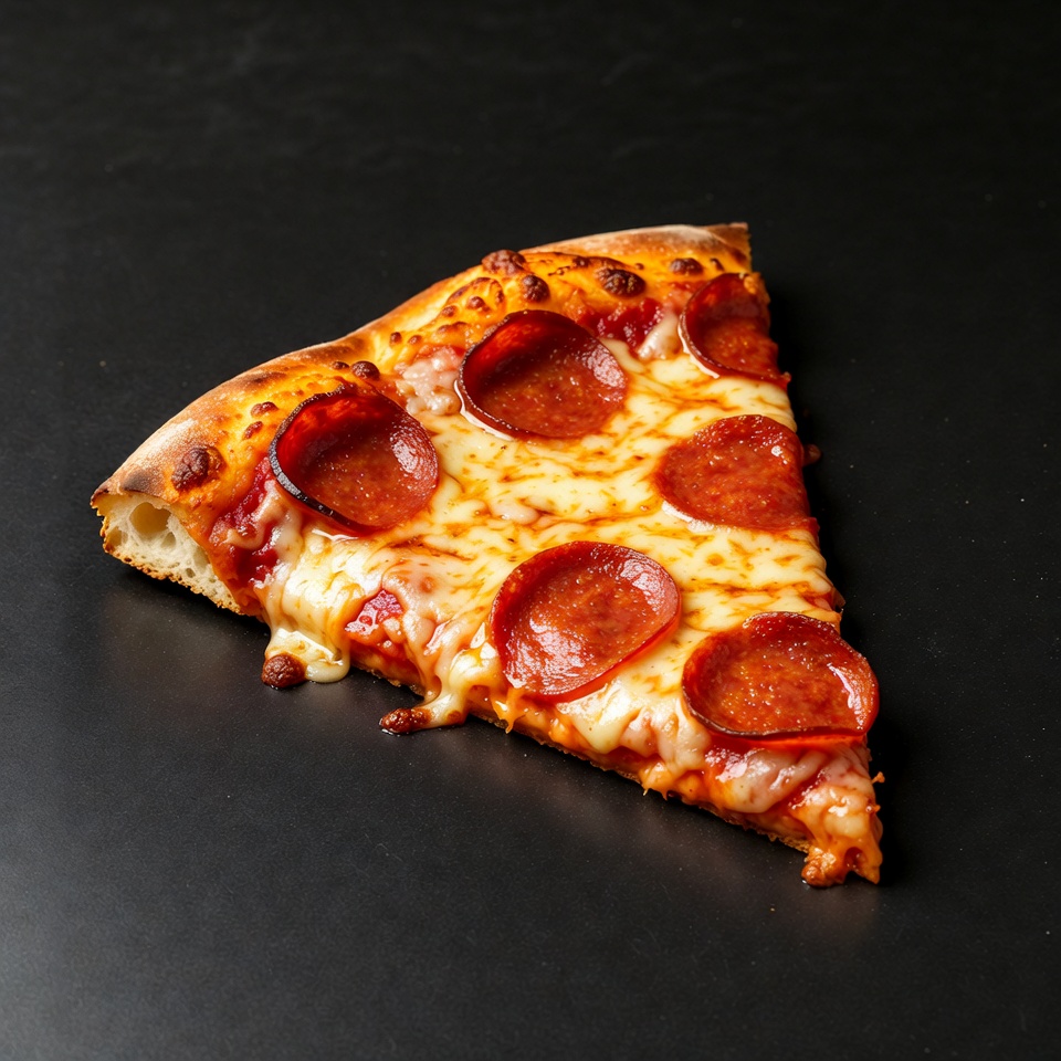 A slice of pepperoni pizza with melted cheese and pepperoni slices sits on a black background. The crust is golden and crispy with stretched cheese dripping from the edges. Multiple pepperoni pieces top the gooey mozzarella cheese.