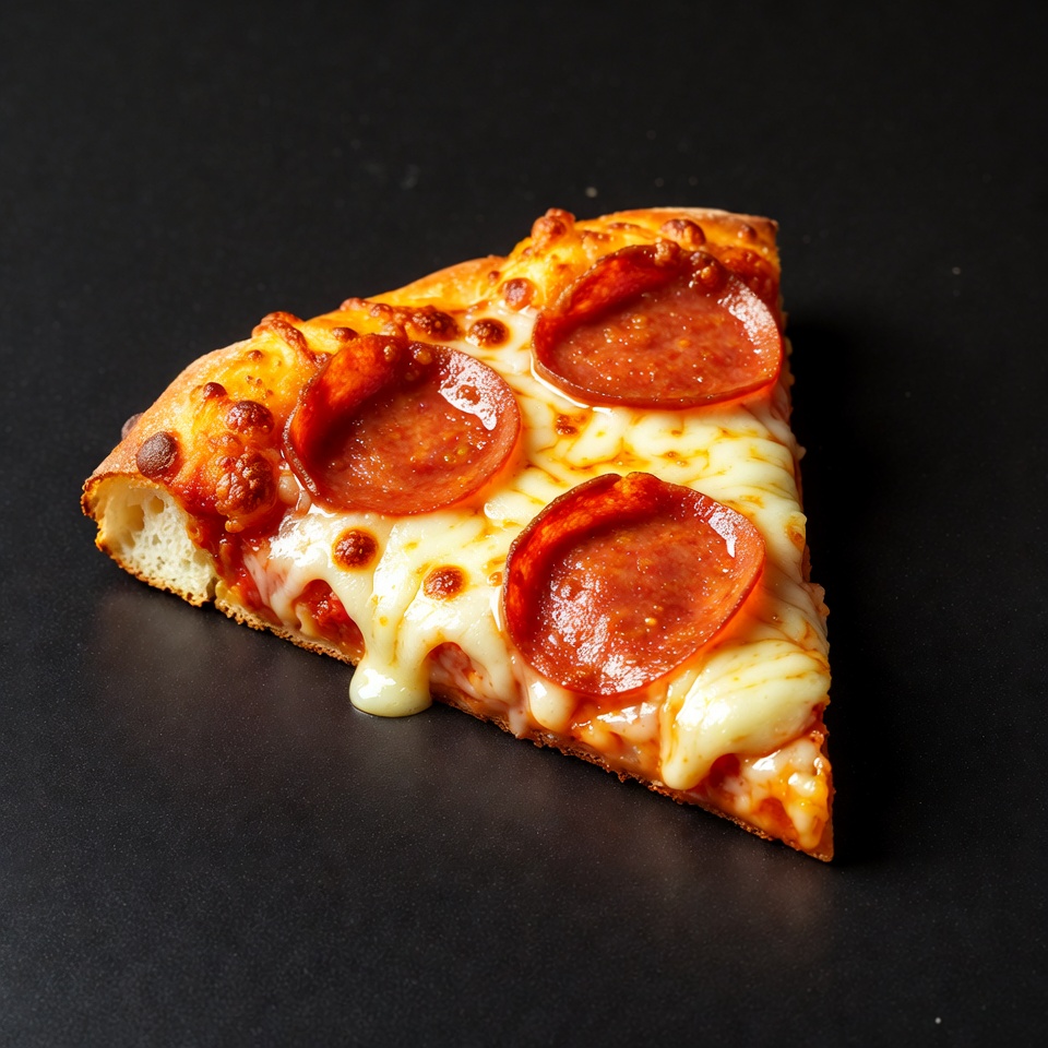 A triangular slice of pepperoni pizza with melted cheese and multiple pepperoni slices sits on a black background. The crust is golden and crispy, with cheese stretching slightly from the toppings. The pepperoni pieces are round and vibrant red against the white cheese.