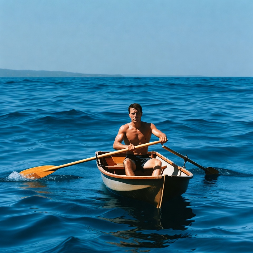 White, blue water, boat, calm sea, clear sky, hills, horizon, male, muscular, oars, ocean, orange oars, outdoors, rowboat, rowing, sea, shirtless, shorts, water, wooden boat, man