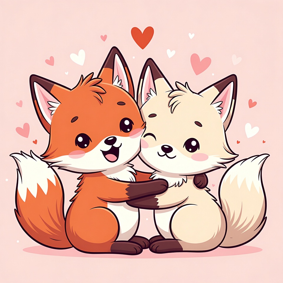 Two adorable cartoon foxes, one orange and one cream-colored, embrace warmly on a pink background. Surrounded by floating pink and red hearts, they have big sparkling eyes and fluffy tails. The illustration features chibi-style foxes sitting close together.