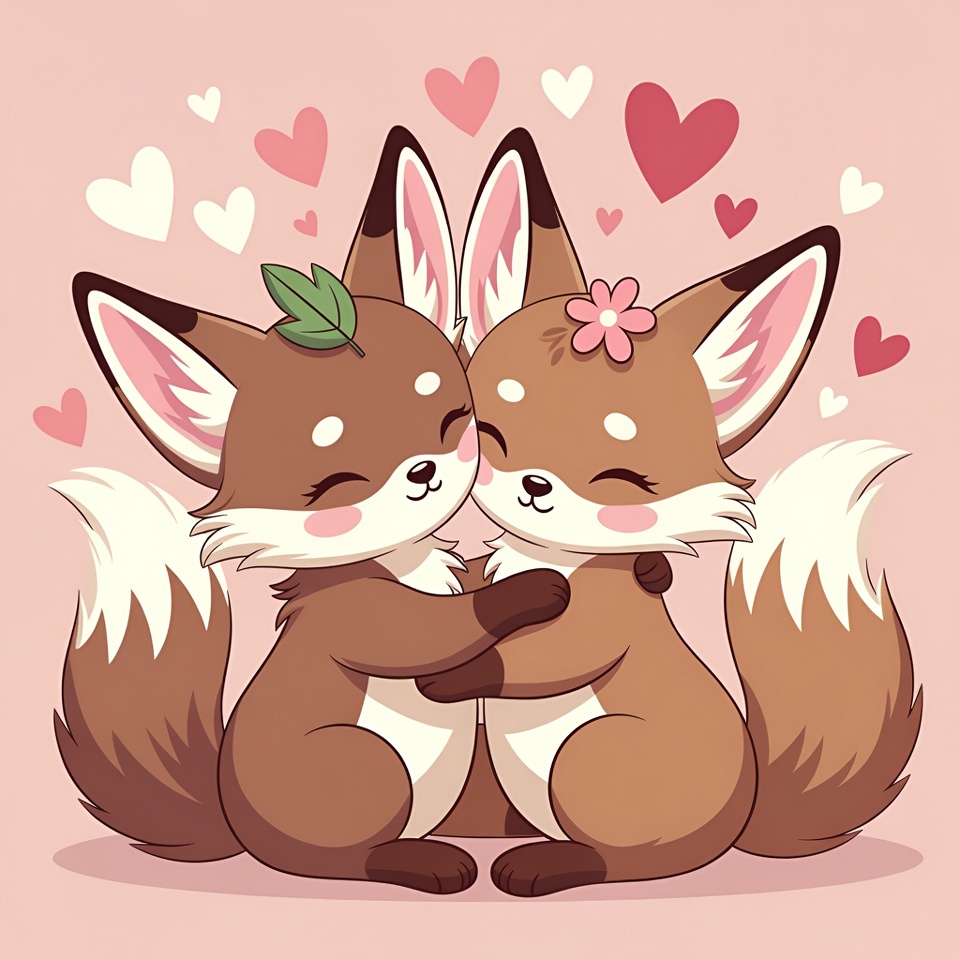 Two adorable cartoon foxes with big eyes and fluffy tails embrace each other lovingly. One fox wears a small flower on its head, and the other has a green leaf. Surrounded by floating pink and white hearts on a soft pink background.