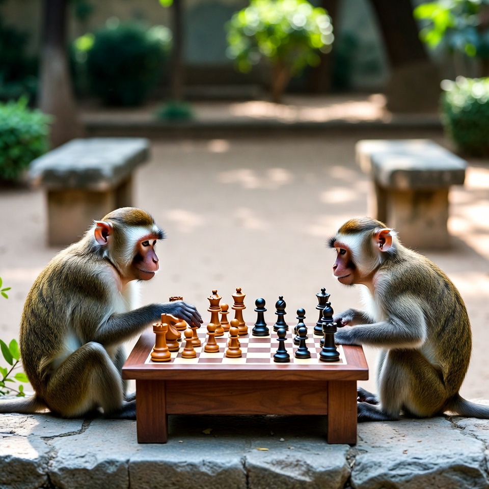 animals, chess, chess pieces, chessboard, focused monkeys, game, garden, outdoors, plants, playing chess, primate, stone benches, strategy, trees, two monkeys, wildlife, wooden table, monkeys