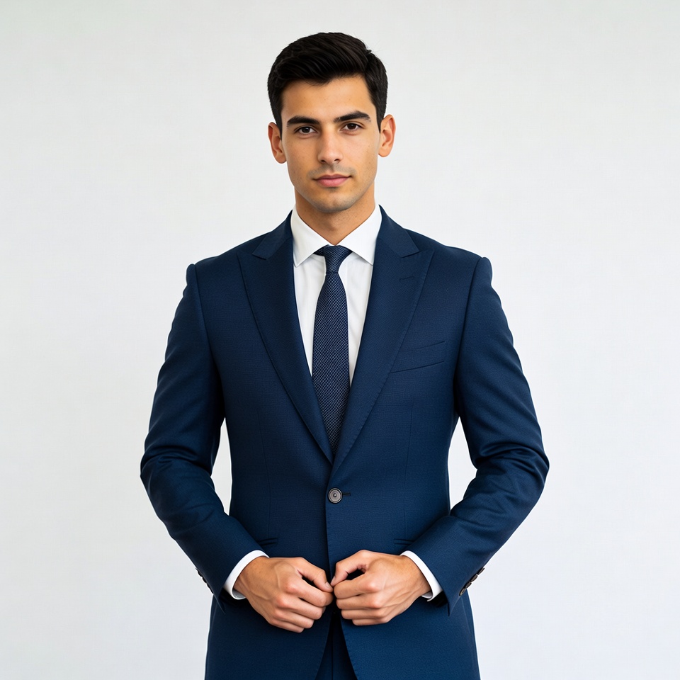 A young man with short dark hair and a trimmed beard stands confidently against a plain white background. He wears a tailored navy blue suit, white dress shirt, and matching dark tie. His hands are clasped in front of him, adjusting his jacket.