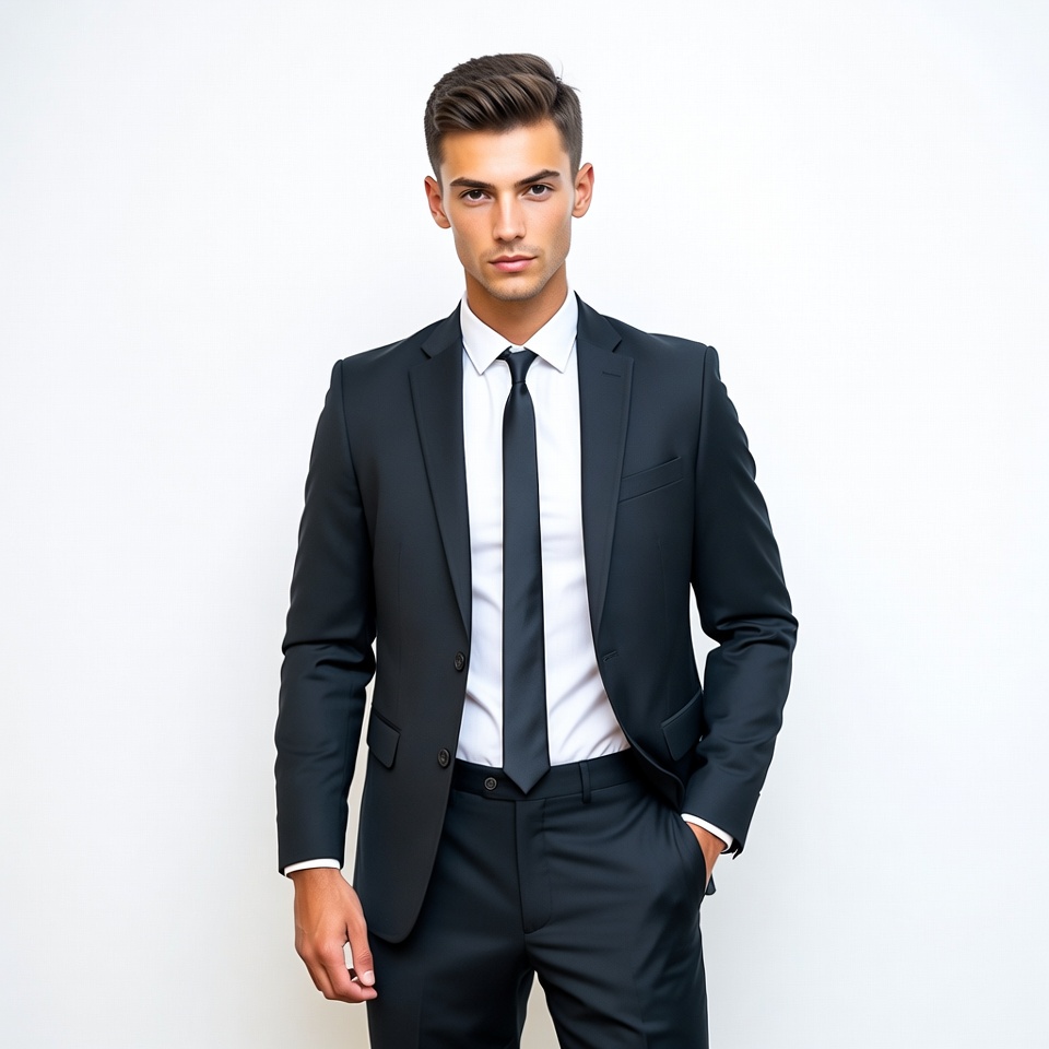A young man with short dark hair and striking blue eyes stands confidently against a white background. He wears a tailored black suit, white dress shirt, and black tie, with hands in pockets. His serious expression and poised stance convey professionalism.