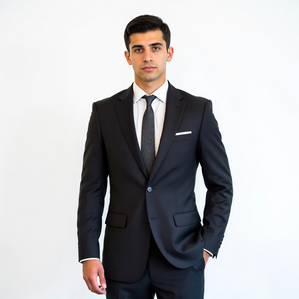 A young Middle Eastern man with short dark hair stands confidently wearing a black suit, white shirt, and gray tie. He has one hand in his pocket and a pocket square in his jacket. The image is isolated against a plain white background.