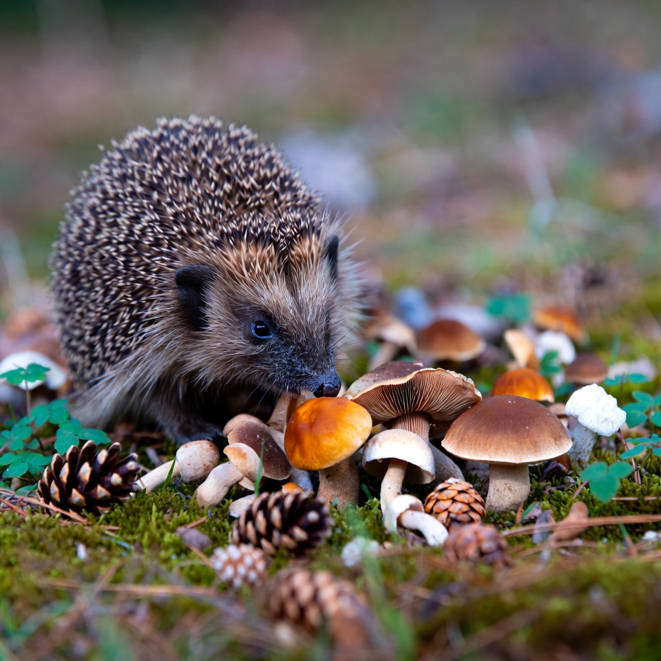 animal eating, autumn forest, clover, european hedgehog, foraging hedgehog, forest floor, hedgehog eating, moss, mushrooms, nature, orange mushrooms, pine cones, white mushrooms, wild animal, wild hedgehog, wildlife, hedgehog