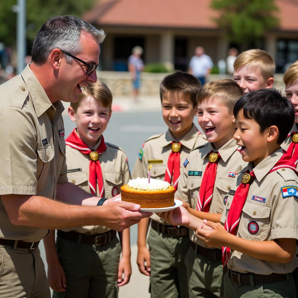 A male scout leader in uniform smiles while holding a plate with a frosted orange birthday cake topped with candles. He presents it to a group of smiling young boys wearing scout uniforms and neckerchiefs. They stand together outdoors near a building on a sunny day.