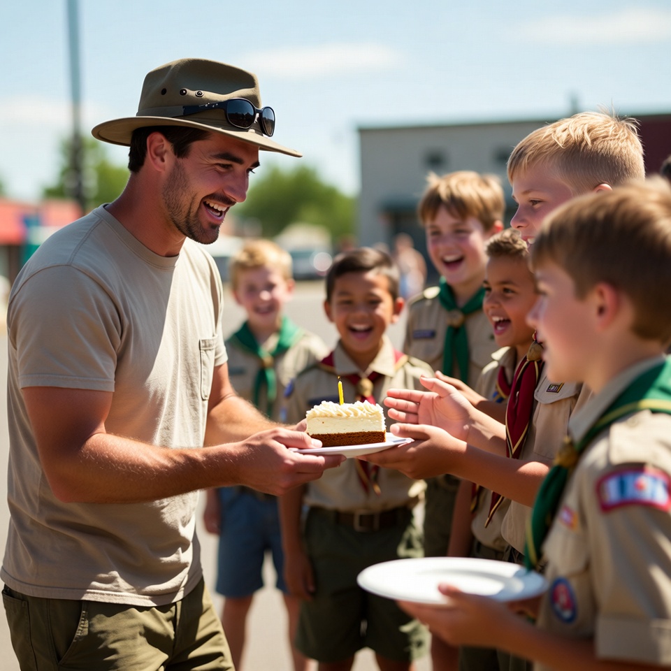White, birthday cake, birthday celebration, boys, boyscout uniform, cake candles, cub scouts, excited boys, green uniform, group boys, group photo, holding cake, holding plate, khaki shirt, male, man, outback hat, outdoor, scout event, scout leader, smiling faces, smiling man, street background, sunglasses, young boys, boy scouts