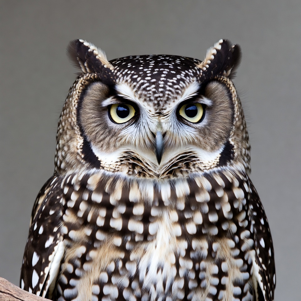 A spotted eagle owl with detailed brown and white feathers stares directly at the camera. Its large yellow eyes and prominent ear tufts are highlighted against a plain gray background. The owl perches on a wooden branch.