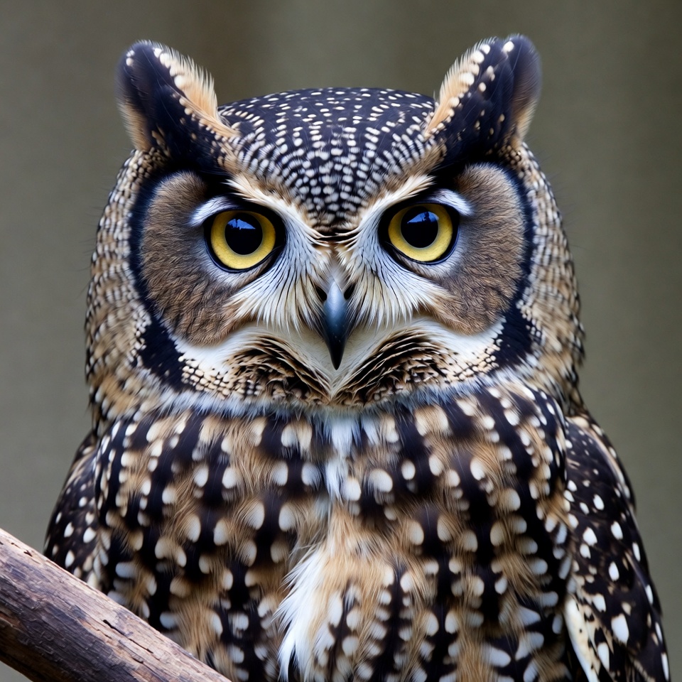 A spotted eagle owl with large yellow eyes stares directly at the camera. Its feathers are intricately patterned with brown, white, and black spots, featuring prominent ear tufts. The owl perches on a wooden branch against a blurred natural background.