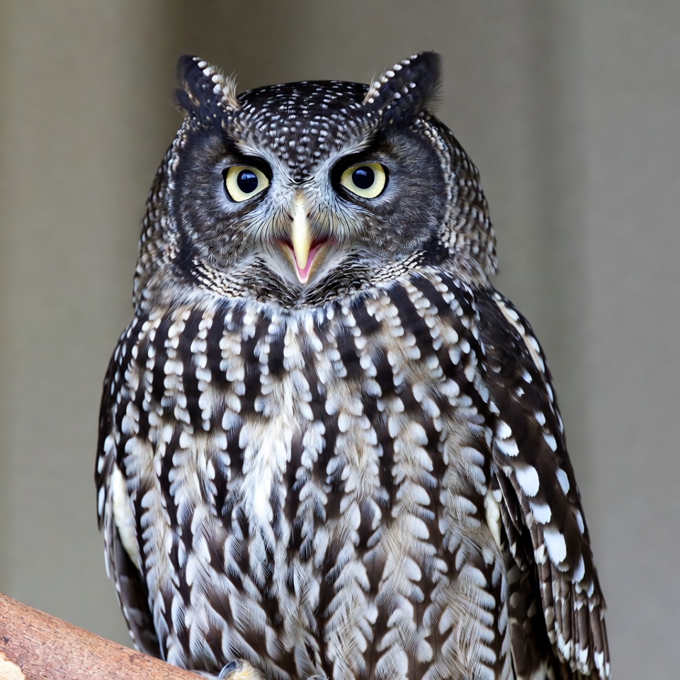 animal, avian, beak, bird, birdwatching, branch, dark plumage, ear tufts, feathers, isolated background, nature, perch, raptor, spotted eagle owl, spotted feathers, white spots, wildlife, yellow eyes, owl