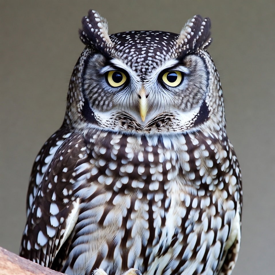 A spotted eagle owl with intricate dark spotted feathers stares directly at the camera. Its large yellow eyes and prominent ear tufts are highlighted against a blurred background. The owl perches on a branch, showcasing its detailed facial feathers and beak.