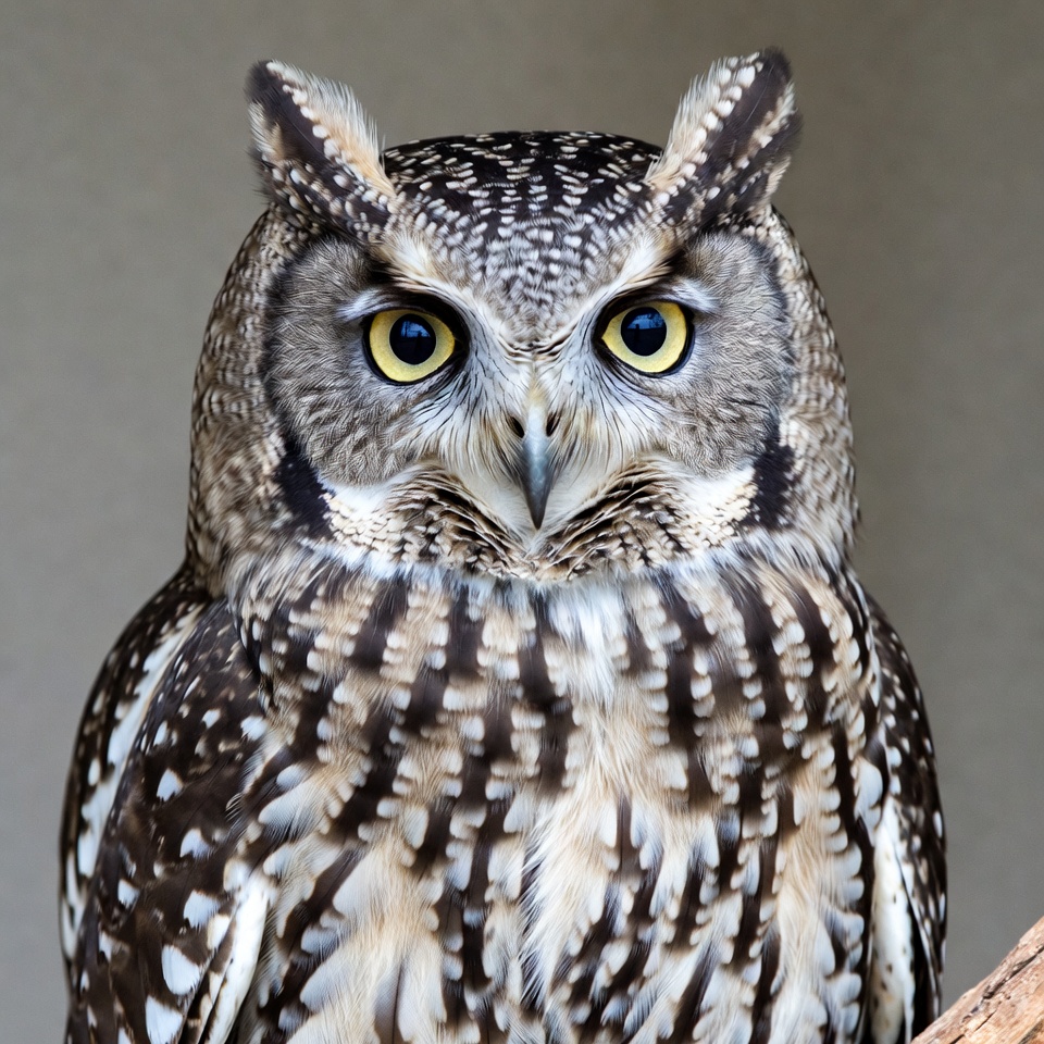 animal eyes, avian, bird, bird portrait, brown feathers, close-up, detailed feathers, feathers, nature, owl face, perched owl, predatory bird, raptor, spotted owl, tufted ears, white spots, wildlife, yellow eyes, owl