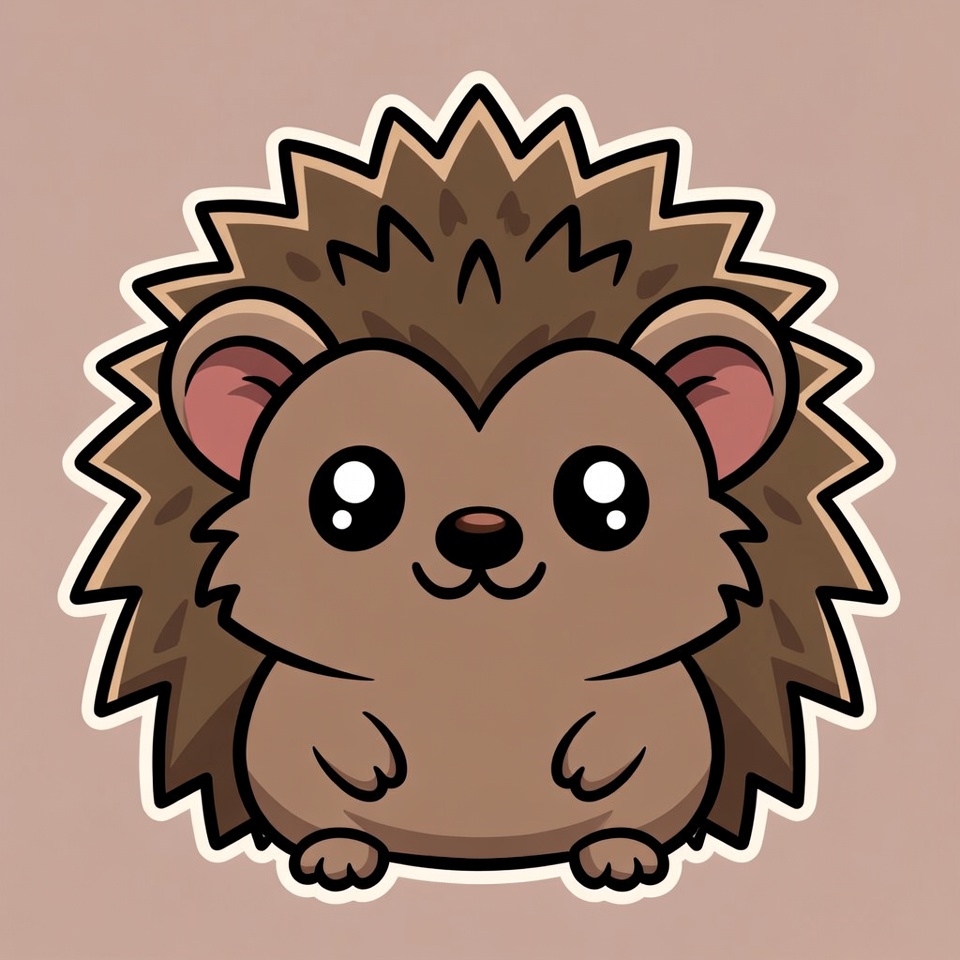 A kawaii-style cartoon hedgehog with brown spiky quills and big shiny eyes smiles happily. It has small pink ears, a tiny nose, and stubby paws on a plain beige background. The illustration features bold black outlines and a chibi design.