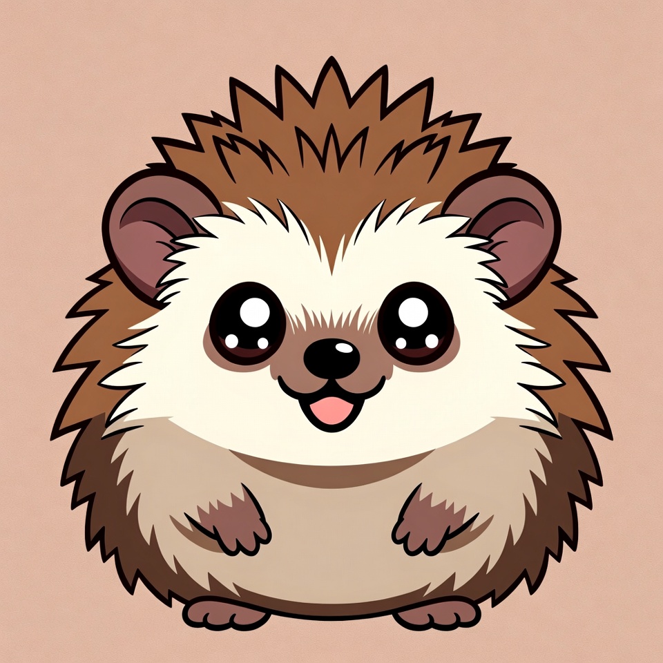 A kawaii-style cartoon hedgehog with large sparkling eyes and a happy smile stands on a plain background. It has brown and white spiky quills, pink cheeks, and tiny paws. The illustration features bold outlines and vibrant colors.