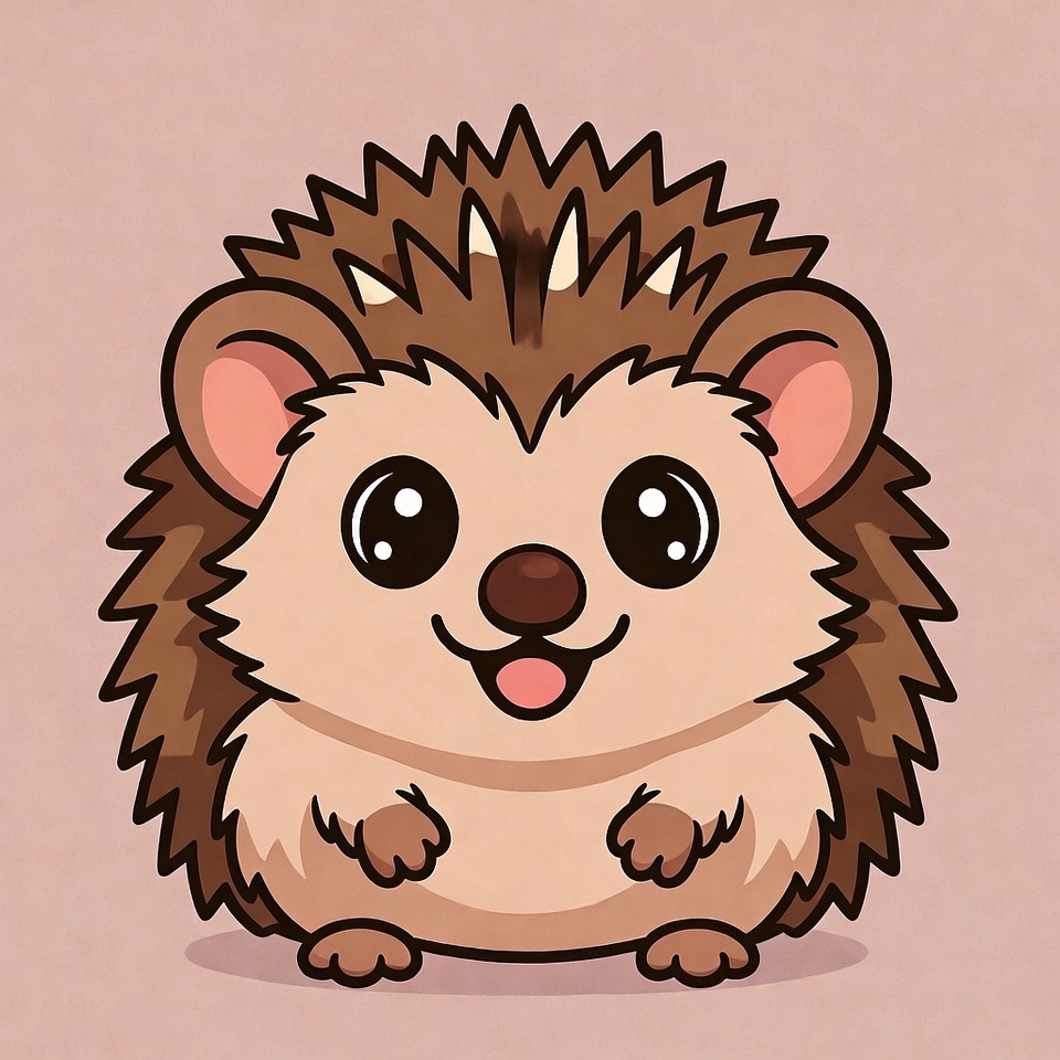 adorable animal, animal illustration, big eyes, brown hedgehog, cartoon hedgehog, chibi style, clipart, cute hedgehog, happy face, isolated background, kawaii hedgehog, pink background, smiling hedgehog, spiky quills, hedgehog