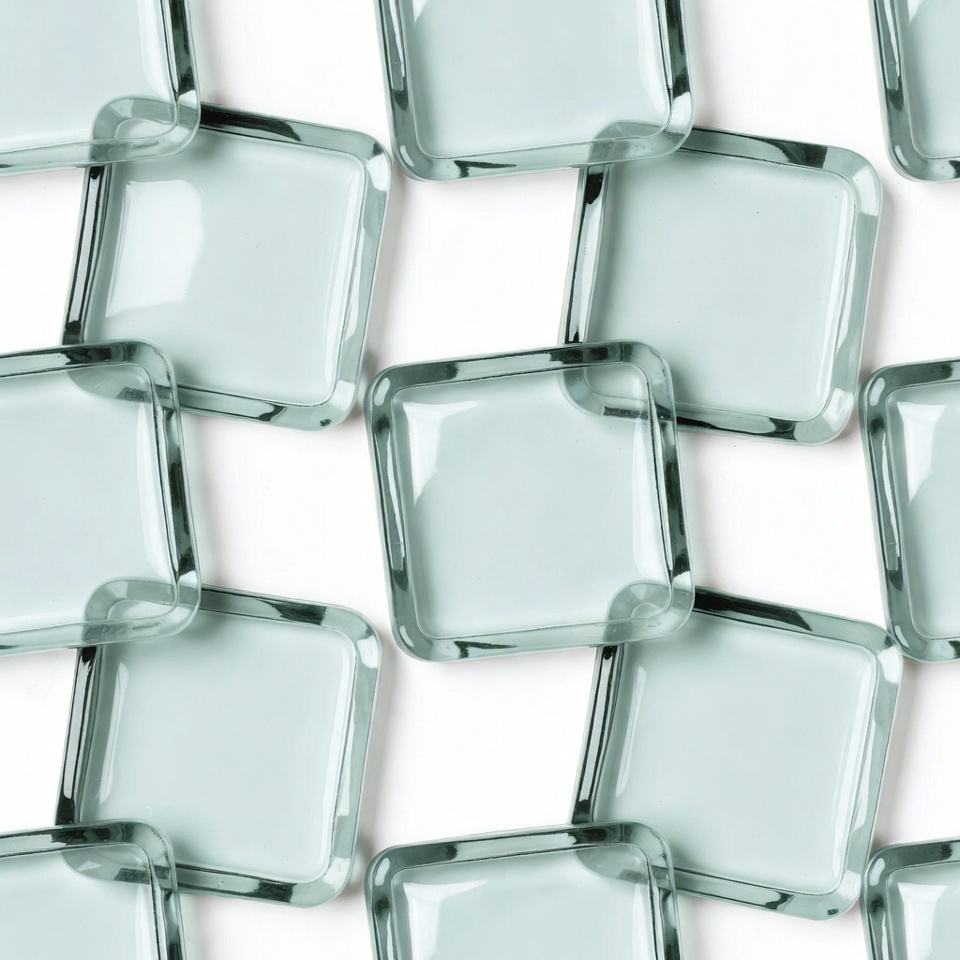 A seamless pattern of square glass tiles arranged in a grid. The tiles are transparent with a light blue tint and glossy surfaces. They are set against a white background.