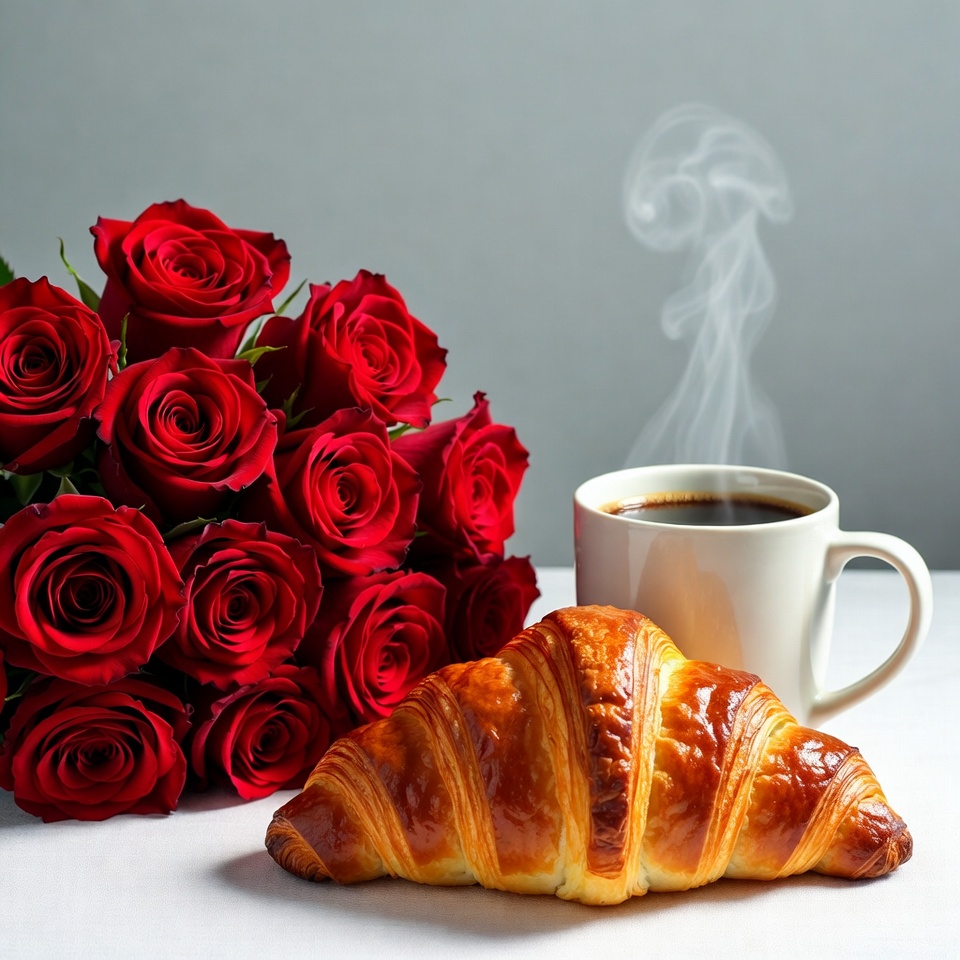 A golden croissant sits on a table next to a white cup of steaming black coffee. A large bouquet of vibrant red roses is positioned beside them on a plain gray background. Steam rises gently from the hot coffee.