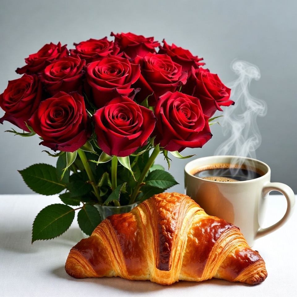 A bouquet of vibrant red roses sits on a table next to a steaming cup of black coffee and a golden croissant. The roses feature lush green leaves and are arranged in a clear glass vase. Steam rises from the coffee cup, adding a warm touch to the elegant still life setup.