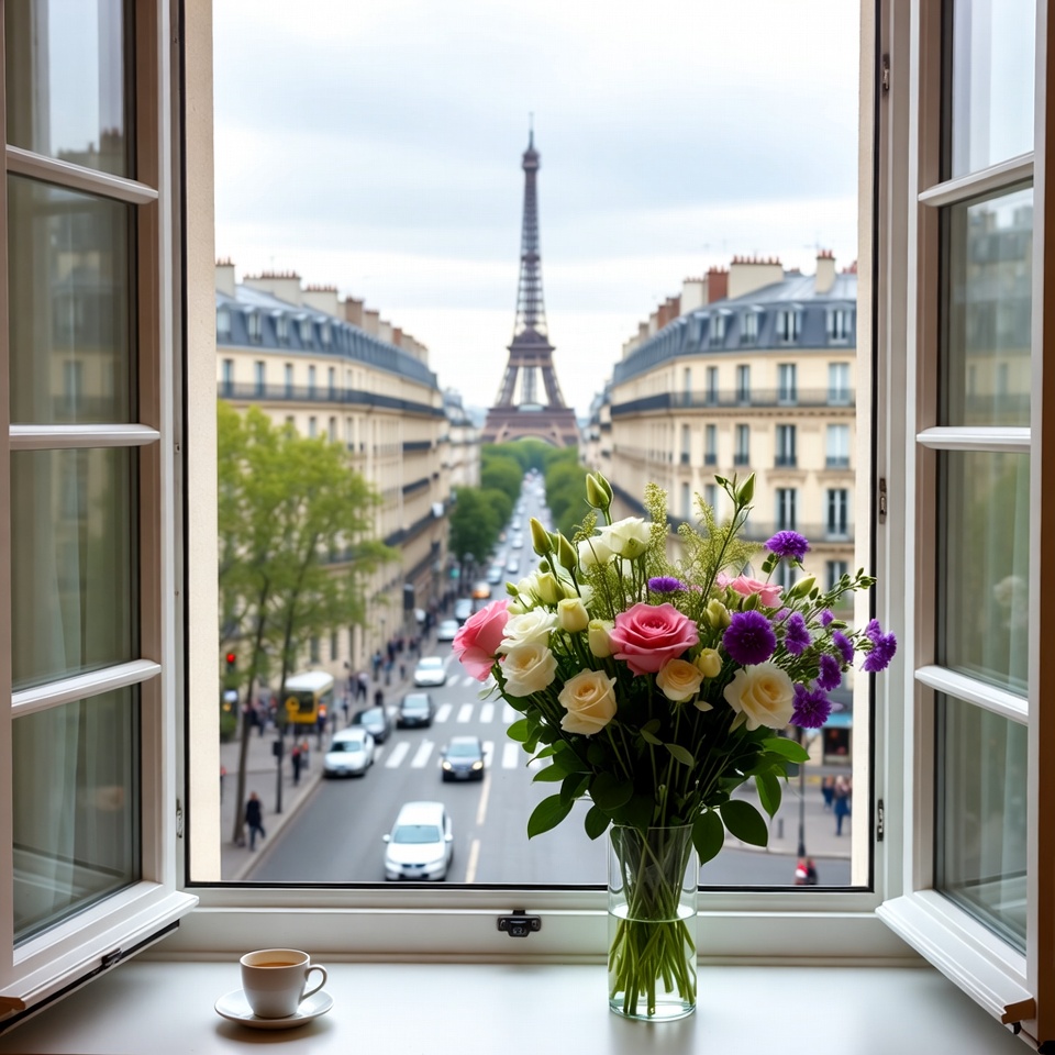 A window frames a stunning view of the Eiffel Tower across a Parisian street with Haussmann-style buildings and light traffic. A vibrant bouquet of multicolored roses and flowers sits in a glass vase on the windowsill. A cup of coffee rests beside a saucer on the white sill.