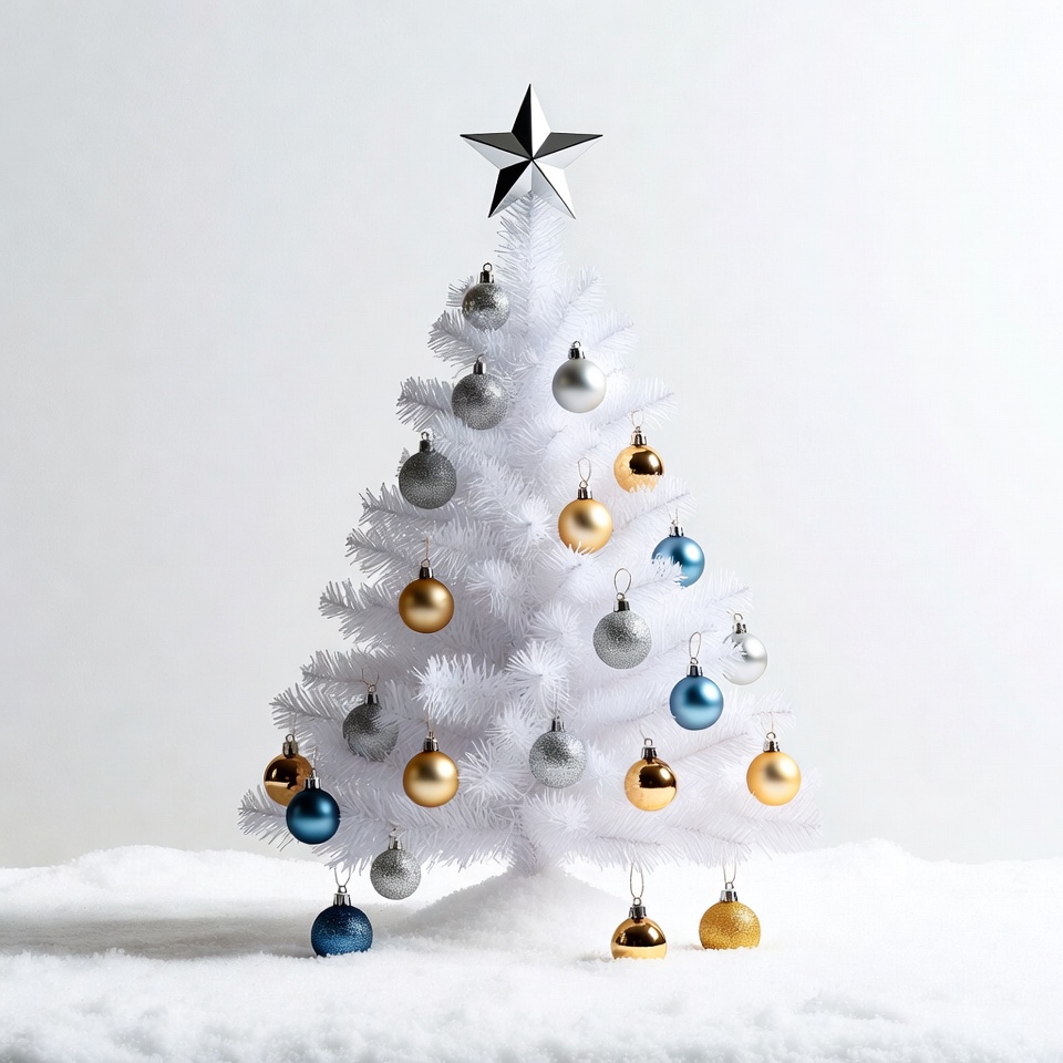 Christmas decorations, artificial tree, blue ornaments, festive tree, gold ornaments, holiday tree, isolated background, ornaments, silver ornaments, silver star, snowy base, star topper, white tree, winter decor, Christmas tree