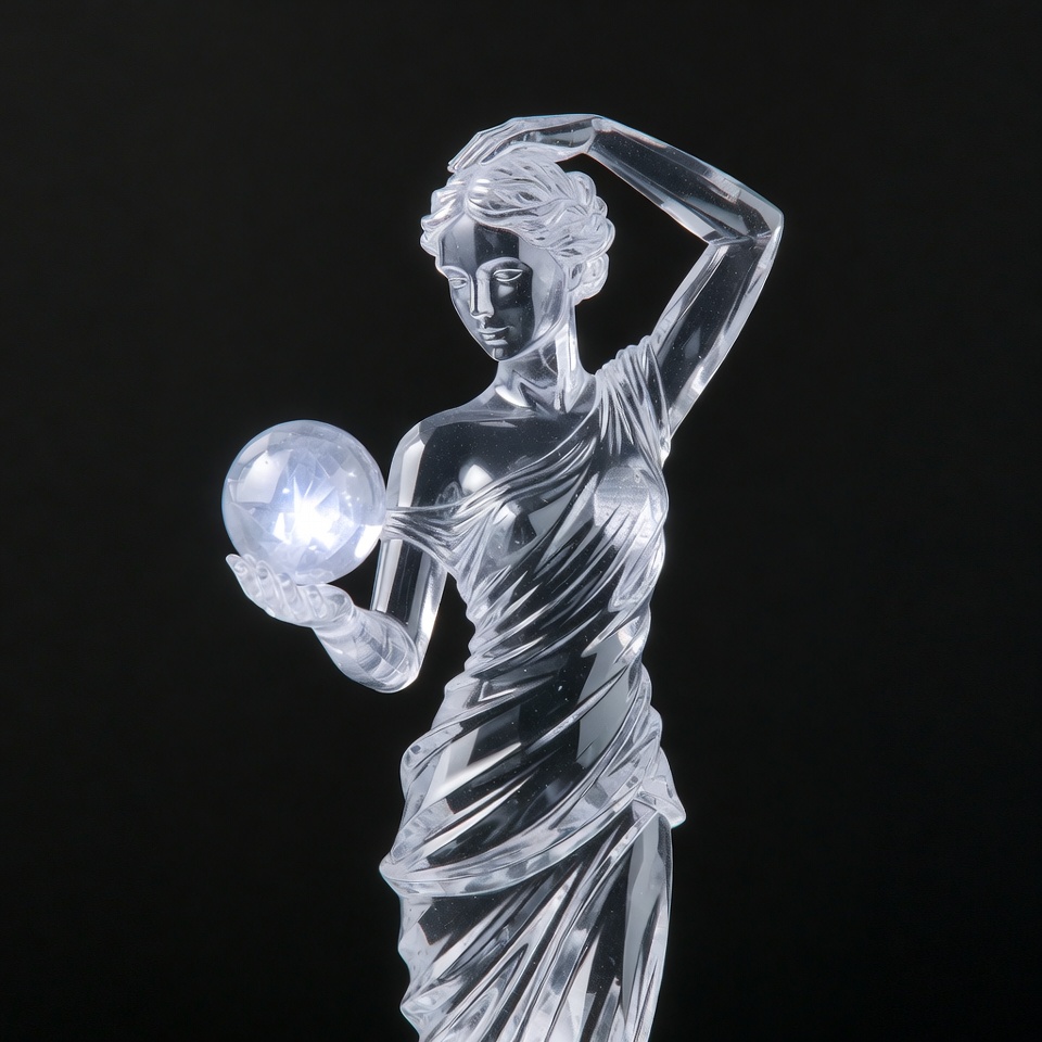 A translucent crystal sculpture depicts a graceful woman in a flowing draped gown holding a glowing white orb in her hand. She raises her other arm elegantly against a solid black background. The statue features detailed facial features and intricate crystal facets.
