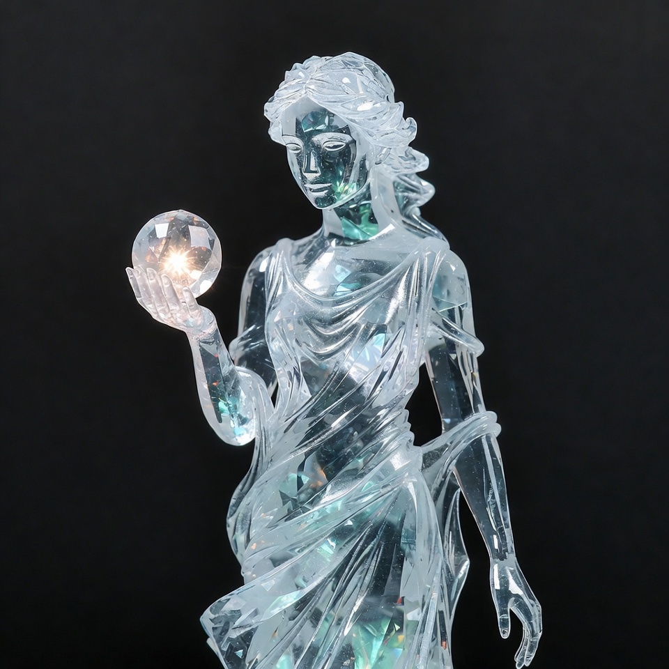 A translucent crystal statue of a woman with flowing hair holds a glowing crystal orb in her hand. She wears a draped gown and stands against a black background. The figure features intricate prismatic details and shines with internal light.