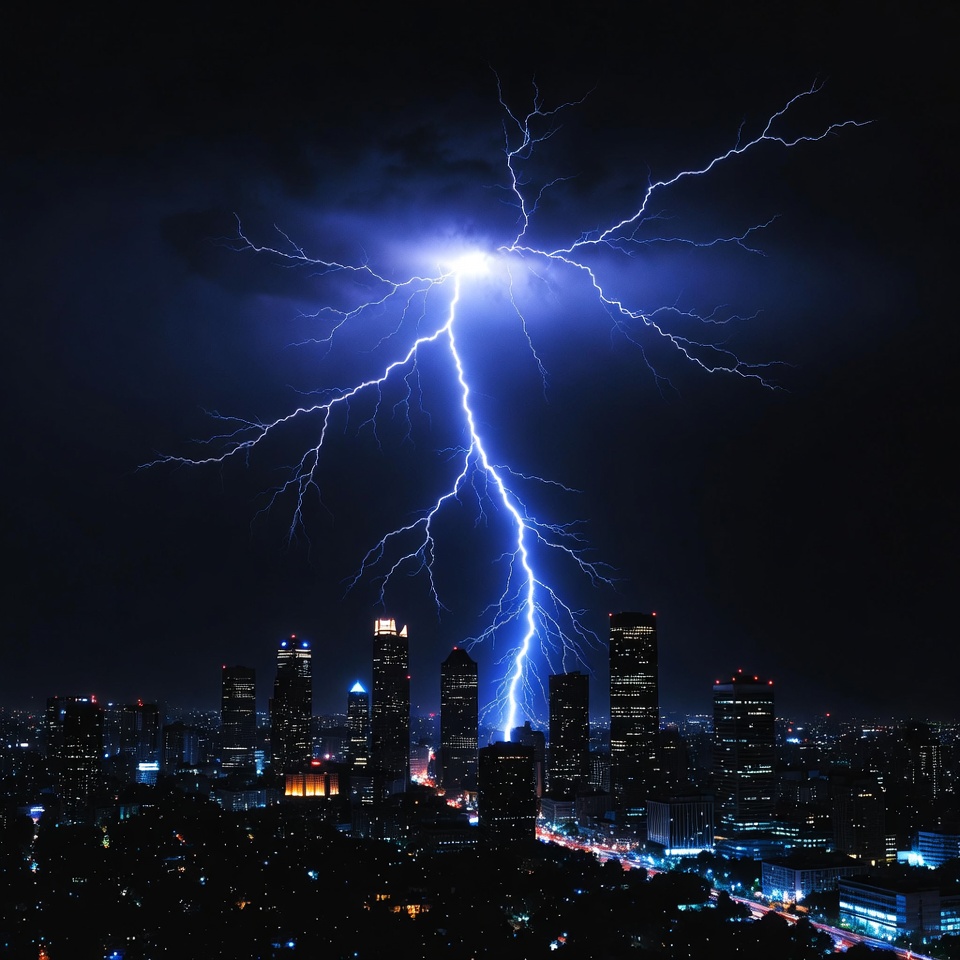 blue lightning, buildings, city skyline, cityscape, clouds, dark sky, dramatic lightning, electricity, metropolis, night, night storm, powerful lightning, sky, skyscrapers, storm, thunderbolt, thunderstorm, urban, weather, lightning