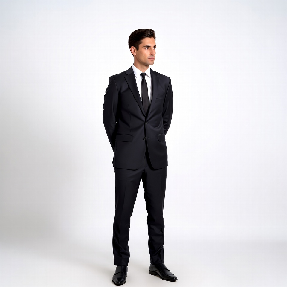 A young man with short dark hair stands confidently with hands in pockets against a plain white background. He wears a tailored black suit, white dress shirt, and black tie. His polished black dress shoes complete the professional look.