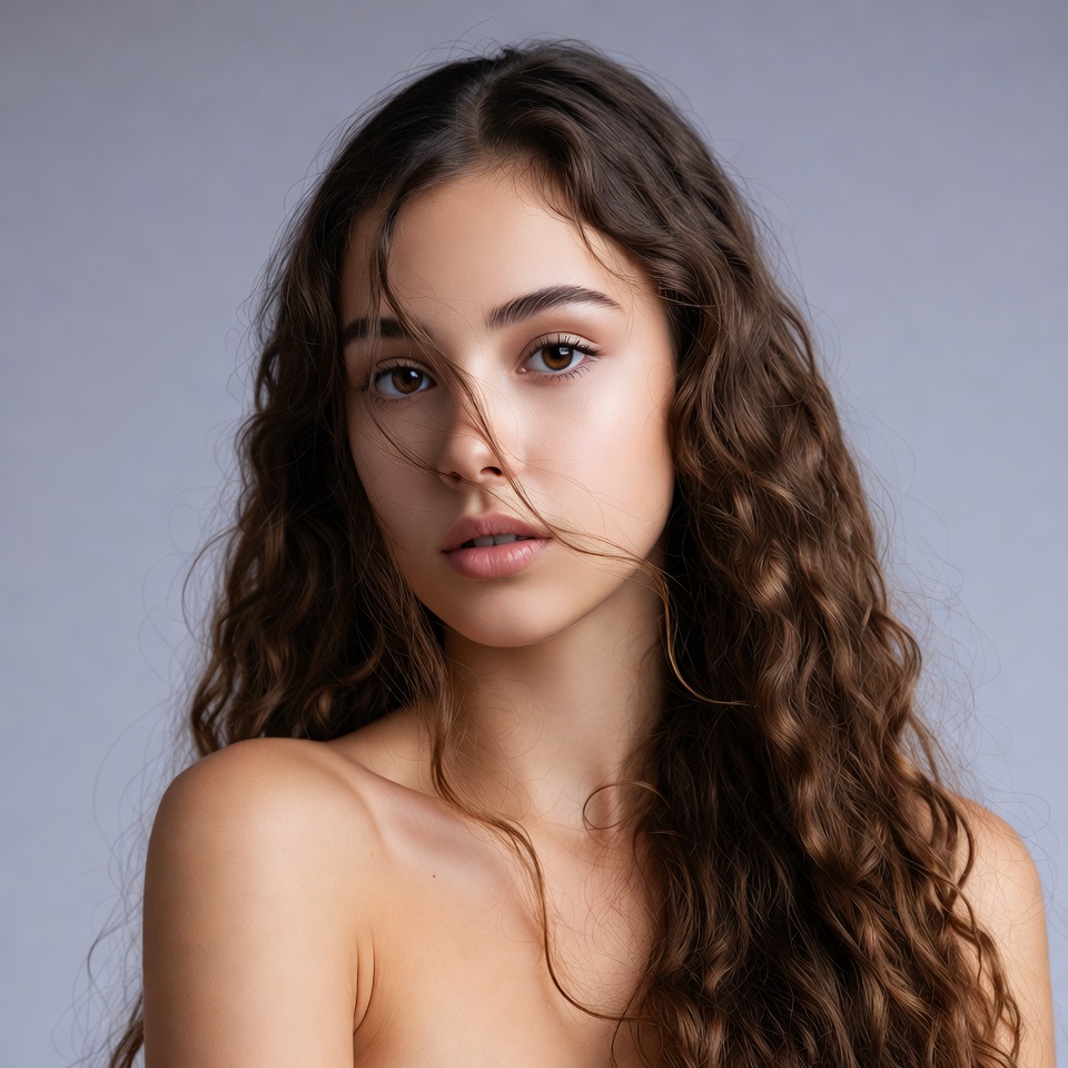 A young woman with long, wavy brown hair gazes directly at the camera against a plain gray background. Her shoulders are bare, revealing smooth skin, and she has striking brown eyes with subtle makeup. Her expression is soft and alluring with slightly parted lips.