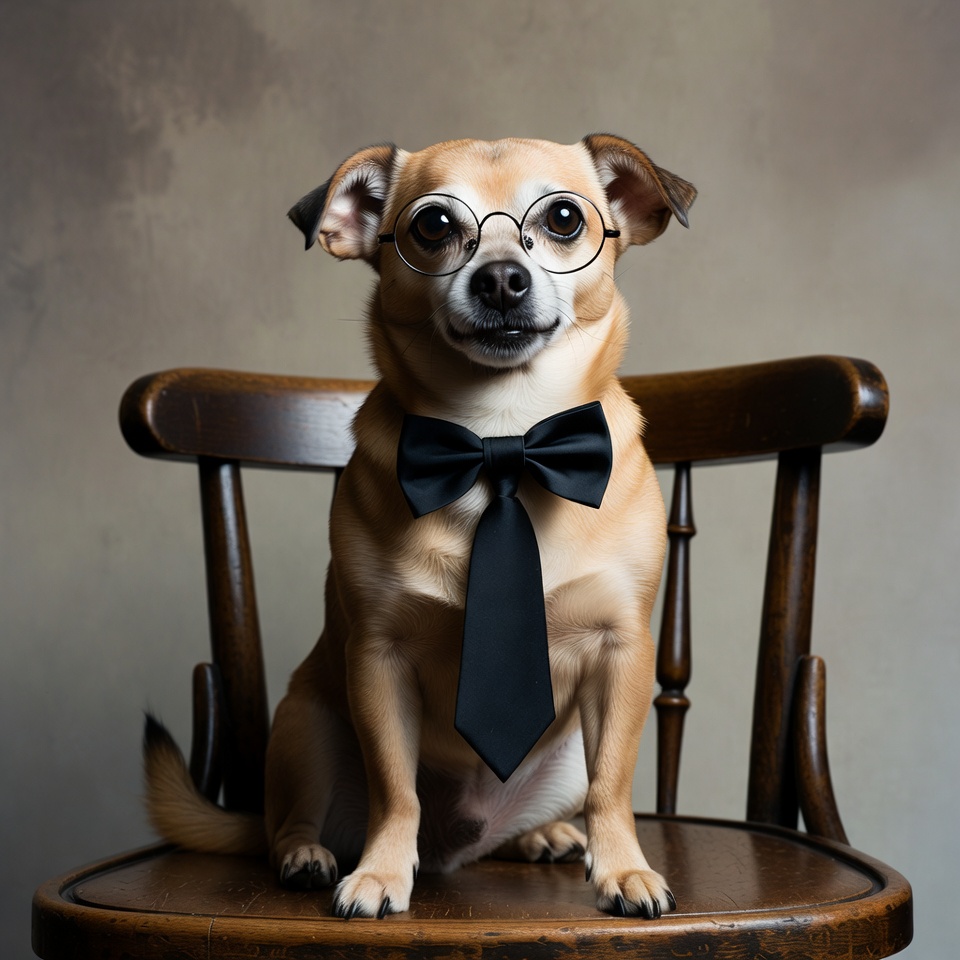 animal, bowtie, cute dog, dog, dressed up dog, formal wear, funny dog, glasses, isolated background, necktie, pet, puppy, round glasses, sitting, small dog, tan fur, wooden chair, Chihuahua