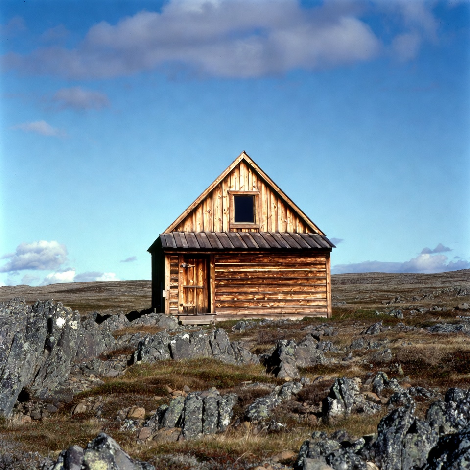 arctic cabin, blue sky, cabin, clouds, gabled roof, isolated building, landscape, mountain cabin, nature, outdoors, remote cabin, rocks, rocky landscape, rustic cabin, small window, sparse grass, tundra, wilderness, wooden cabin, wooden door, log cabin