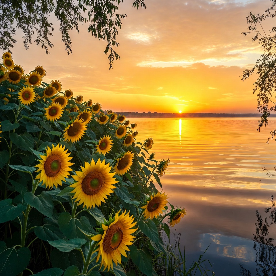 bloom, branches, dusk, field, flowers, golden hour, green leaves, horizon, lake, landscape, nature, orange sky, petals, reflection, riverside, scenery, stems, summer, sunflower field, sunlight, sunset, trees, vibrant, water, yellow flowers, sunflowers