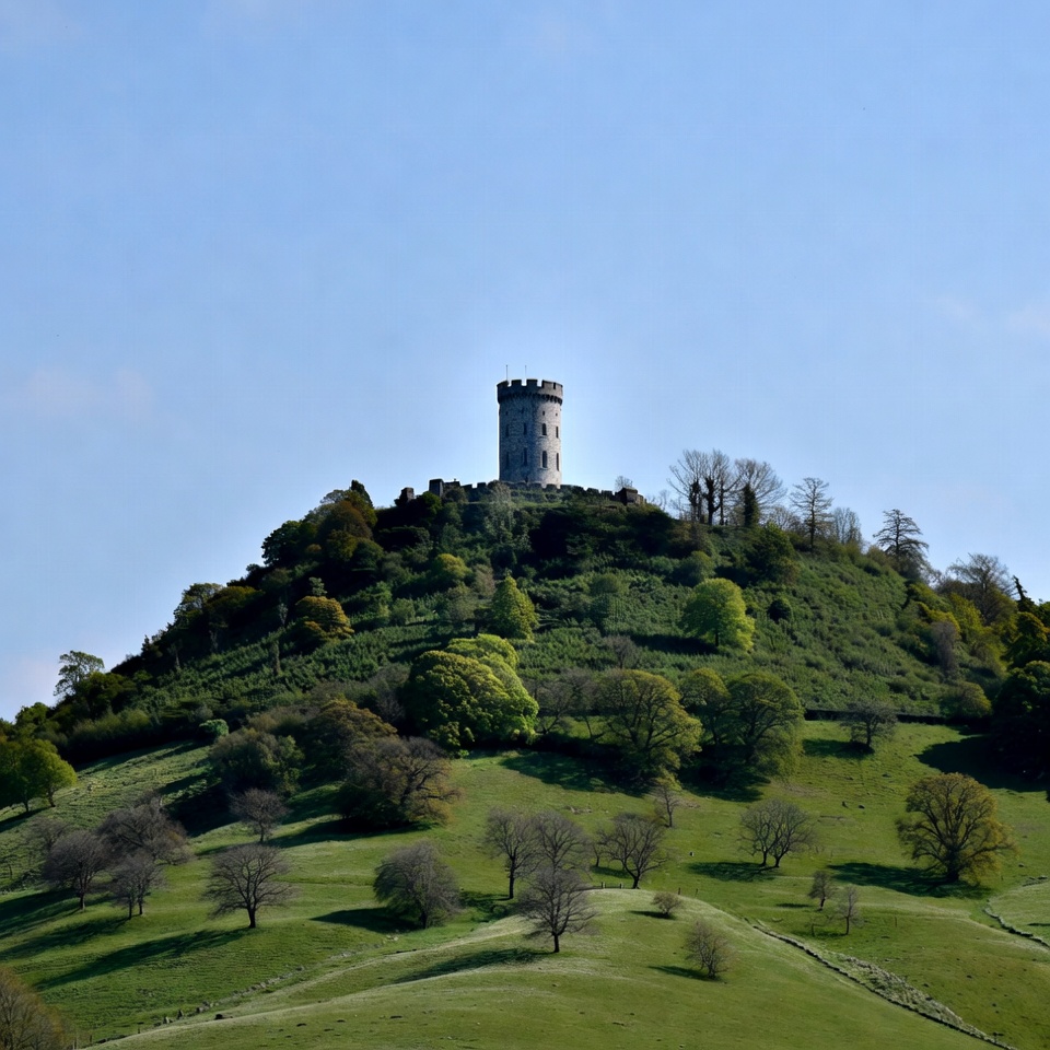 architecture, blue sky, castle tower, countryside, deciduous trees, elevated view, foliage, grass, green hill, hill, hilltop, historic tower, landscape, nature, outdoor, paths, rolling hills, scenery, spring landscape, stone tower, summit, trees, verdant hill, tower