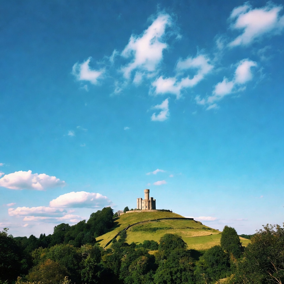 A medieval stone tower sits atop a lush green hill surrounded by trees under a bright blue sky with scattered white clouds. The structure features a tall, cylindrical keep with battlements. The hill rises prominently from the verdant landscape.