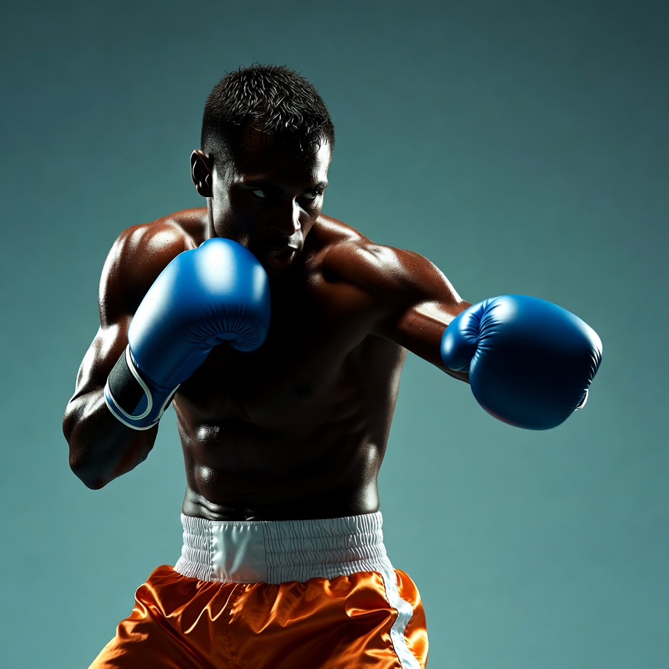African-American, abs, action pose, arms raised, athlete, blue gloves, bodybuilder, boxing, boxing gloves, boxing pose, combat sport, fighter, fitness, intense, male, man, muscular, orange shorts, punching, shirtless, sportsman, stance, strong man, teal background, workout, boxer