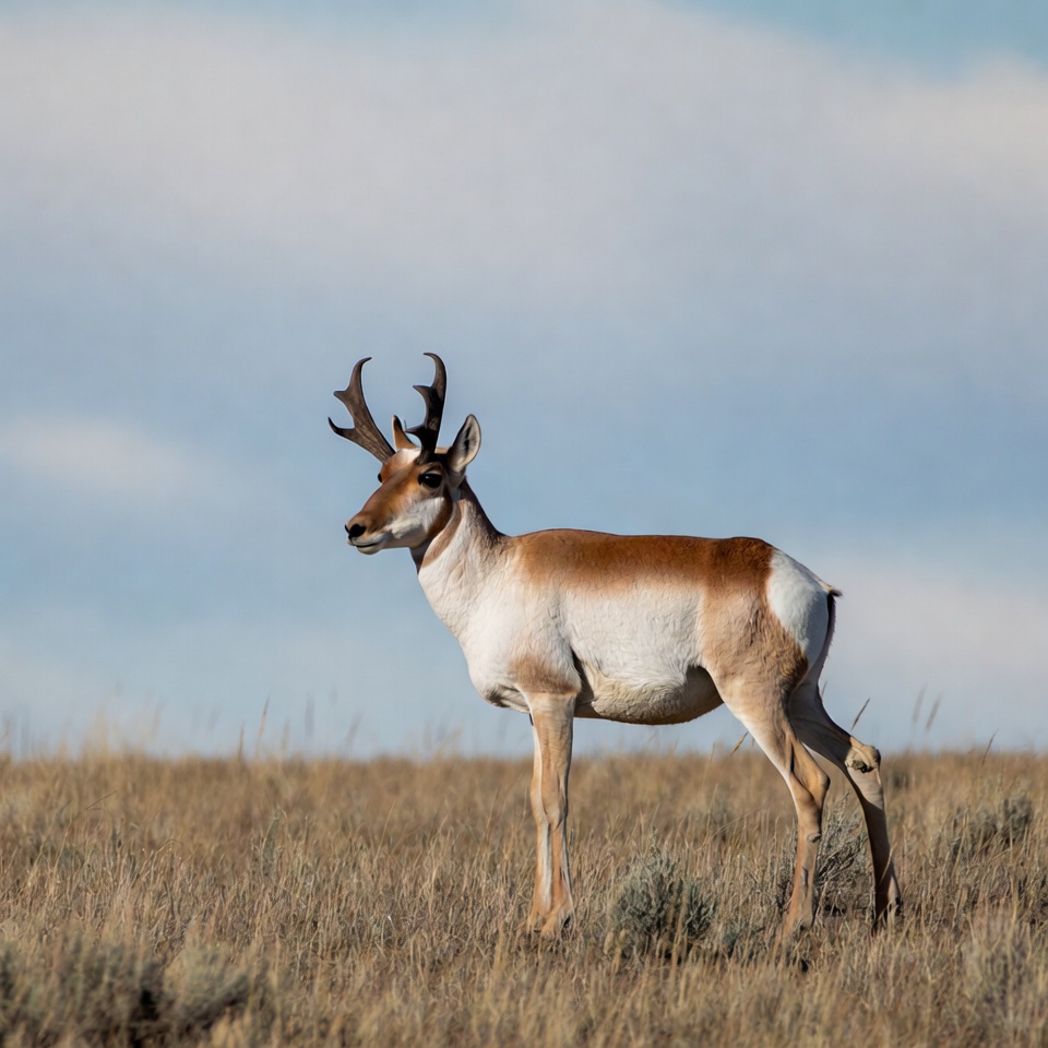 animal, antelope, blue sky, buck, clouds, dry grass, field, grassland, horns, isolated background, nature, outdoors, prairie, profile view, shrubs, standing, tan coat, white rump, wild animal, wildlife, pronghorn