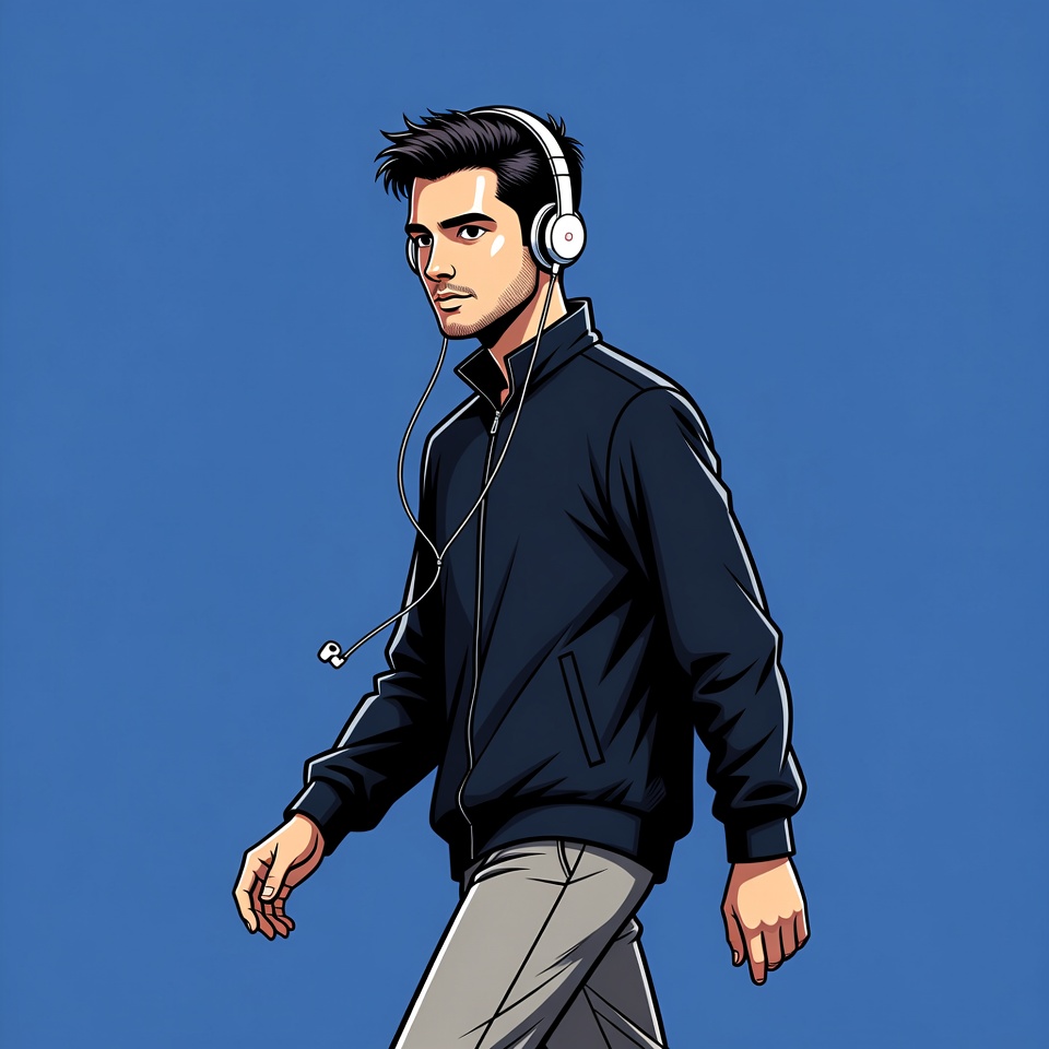 A young man with dark hair walks confidently against a solid blue background. He wears white over-ear headphones, a black zip-up jacket, and gray pants. The image is a vibrant illustration with bold outlines.