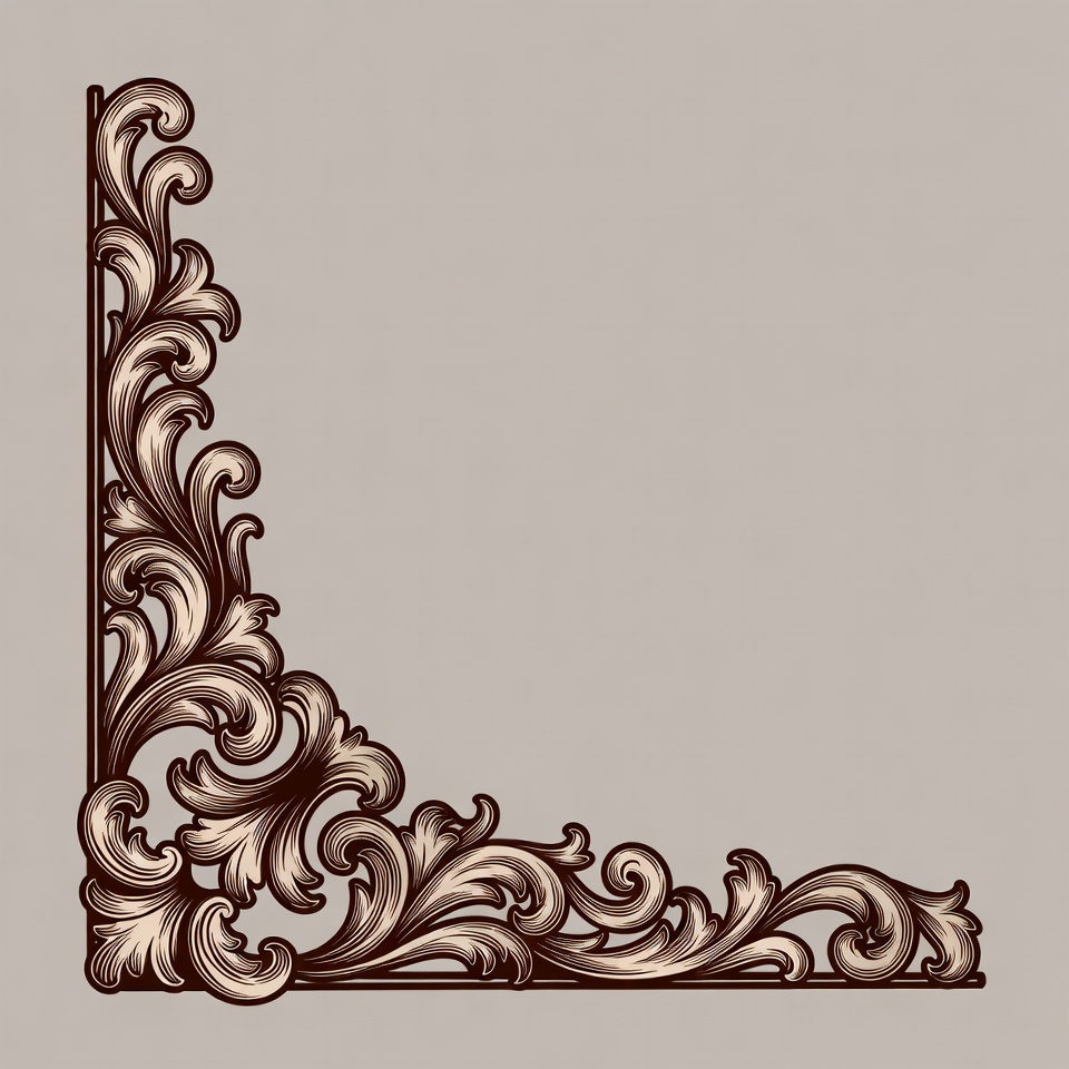 artistic border, baroque style, beige ornament, black outline, clipart, curl motif, decorative corner, elegant border, filigree design, floral ornament, floral swirl, graphic element, illustration, isolated background, leaf pattern, ornate frame, swirling vines, vector design, vintage decoration, corner border